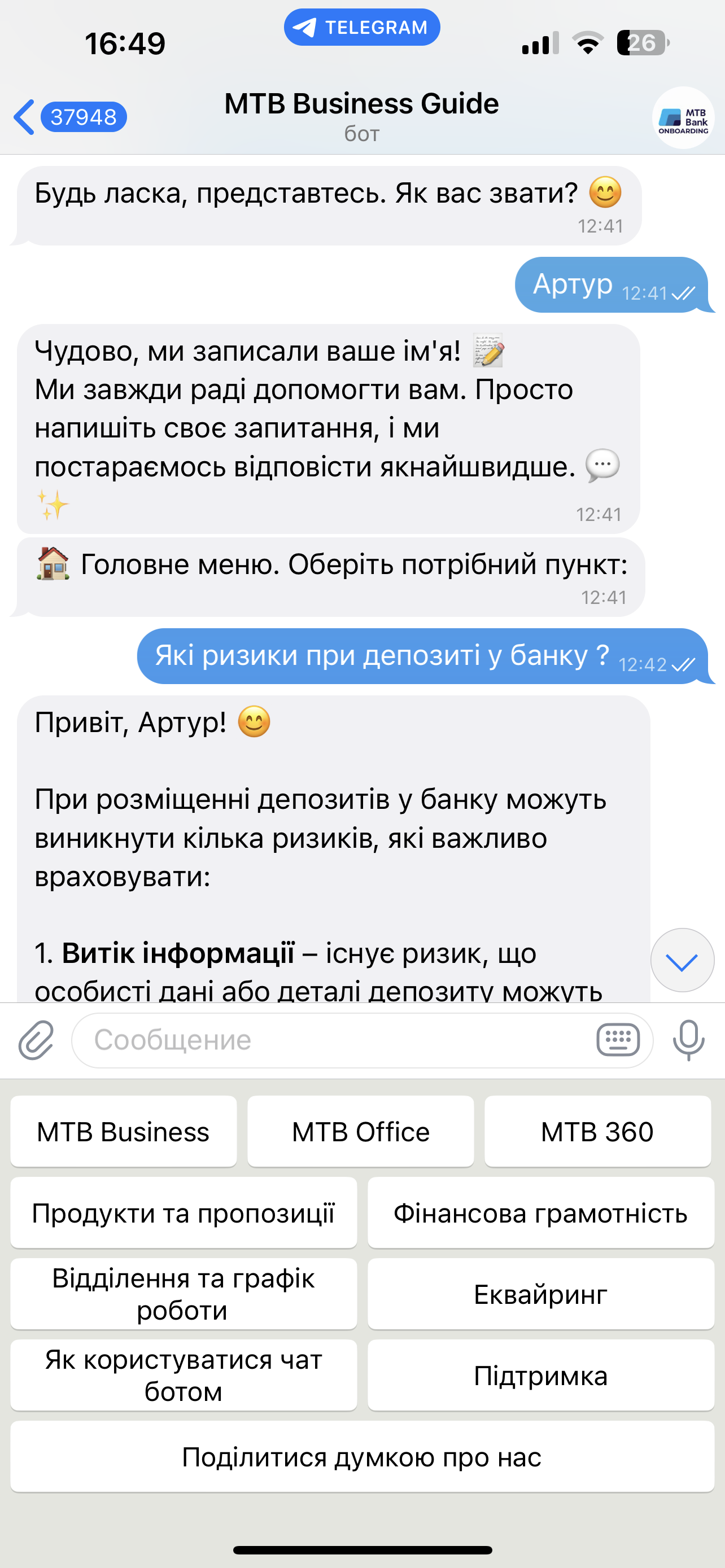 The AI chatbot for banks is a smart assistant that automates customer service, provides consultations on banking services, collects request analytics, shares branch addresses, and responds like a real human.